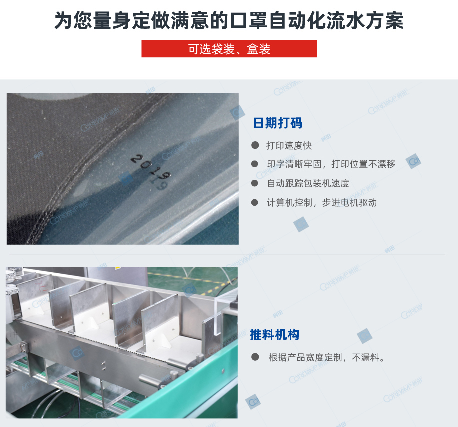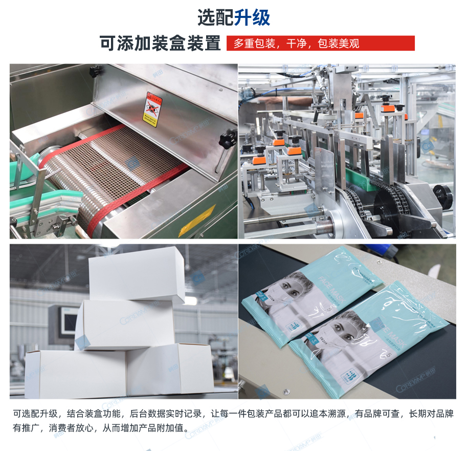 口罩包装装盒生产线是一款由口罩包装机和装盒机组合起来的平面口罩包装如何的生产线设备,该可以自动化完成口罩的一次装袋,然后再进行二次的装盒操作。